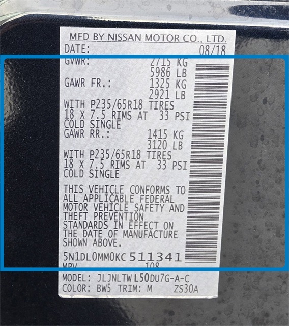 - VIN : 5N1DL0MM0KC511341