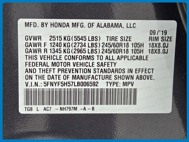 - VIN : 5FNYF5H57LB006592