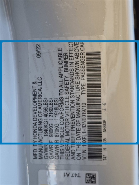 - VIN : 19XFL1H83NE019710