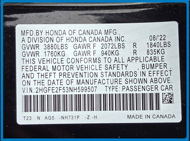 - VIN : 2HGFE2F53NH599507