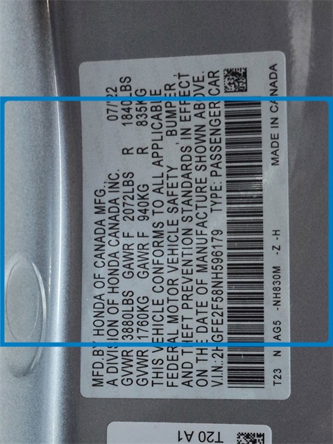 - VIN : 2HGFE2F58NH596179