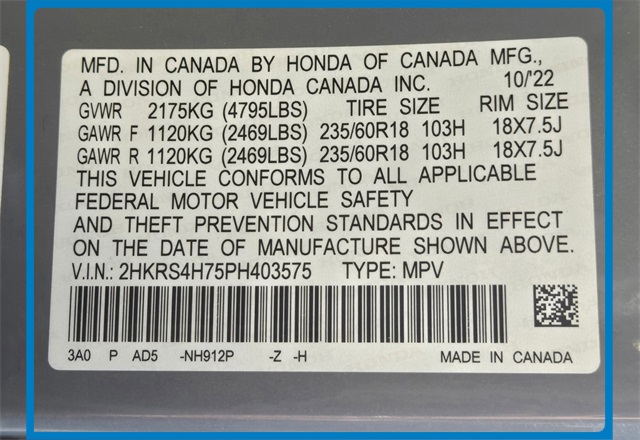 - VIN : 2HKRS4H75PH403575