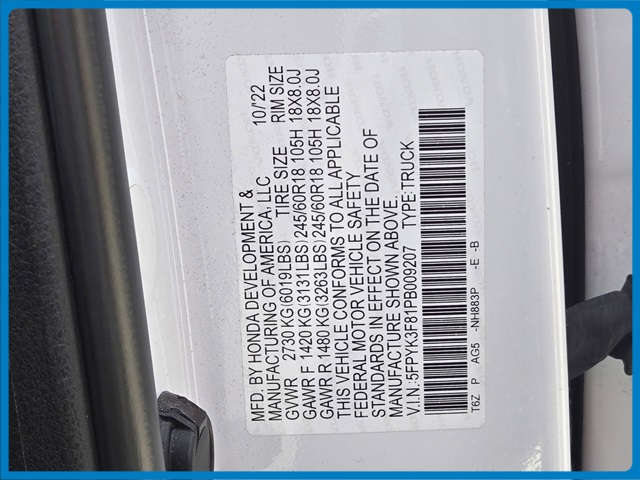 - VIN : 5FPYK3F81PB009207