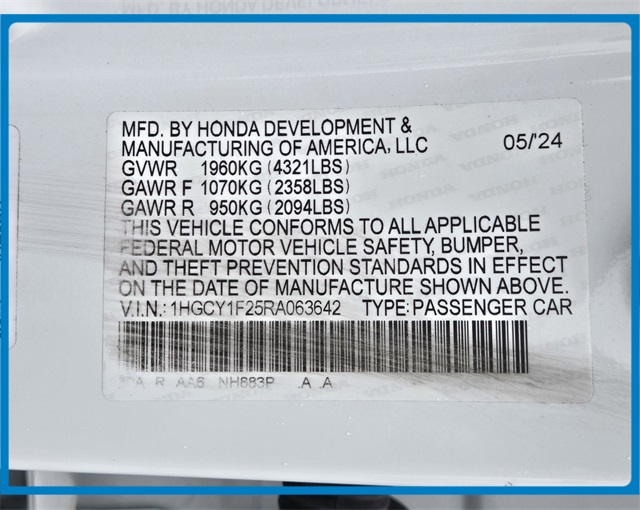- VIN : 1HGCY1F25RA063642
