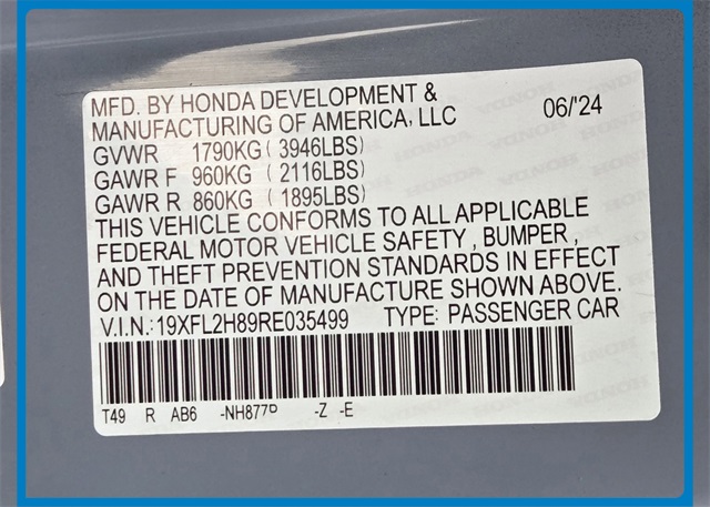 - VIN : 19XFL2H89RE035499
