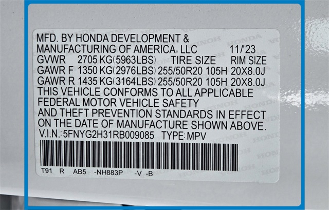 - VIN : 5FNYG2H31RB009085