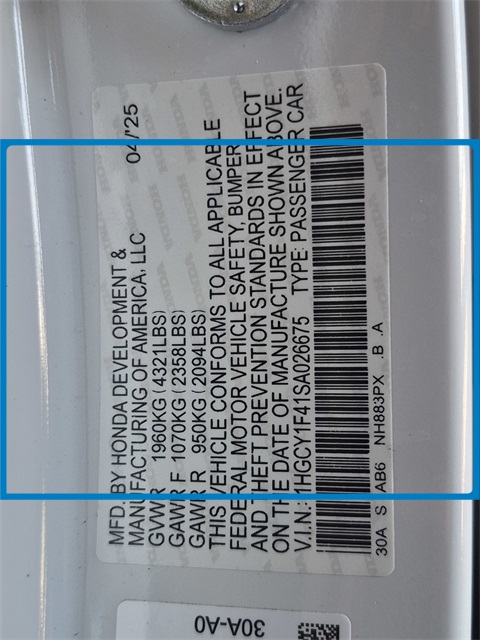 - VIN : 1HGCY1F41SA026675