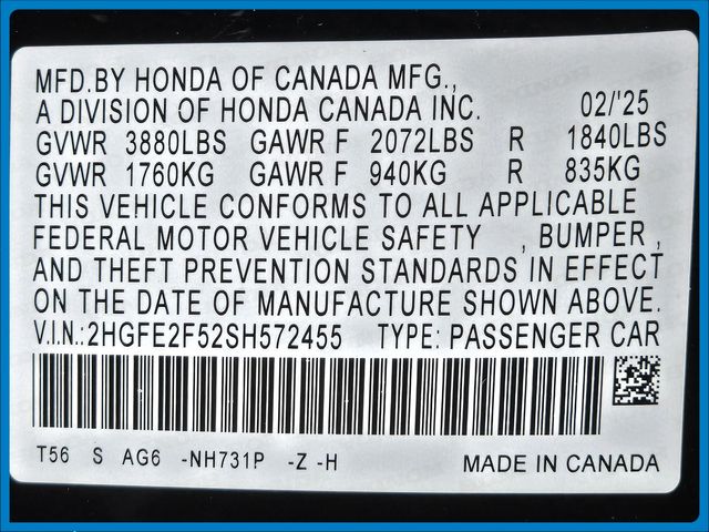- VIN : 2HGFE2F52SH572455